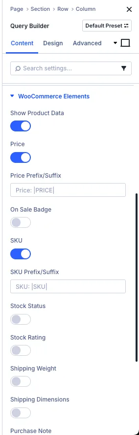 The following options will be shown for the current page and post query types. If you have chosen products as the query post type, the following options will display the relevant WooCommerce data.