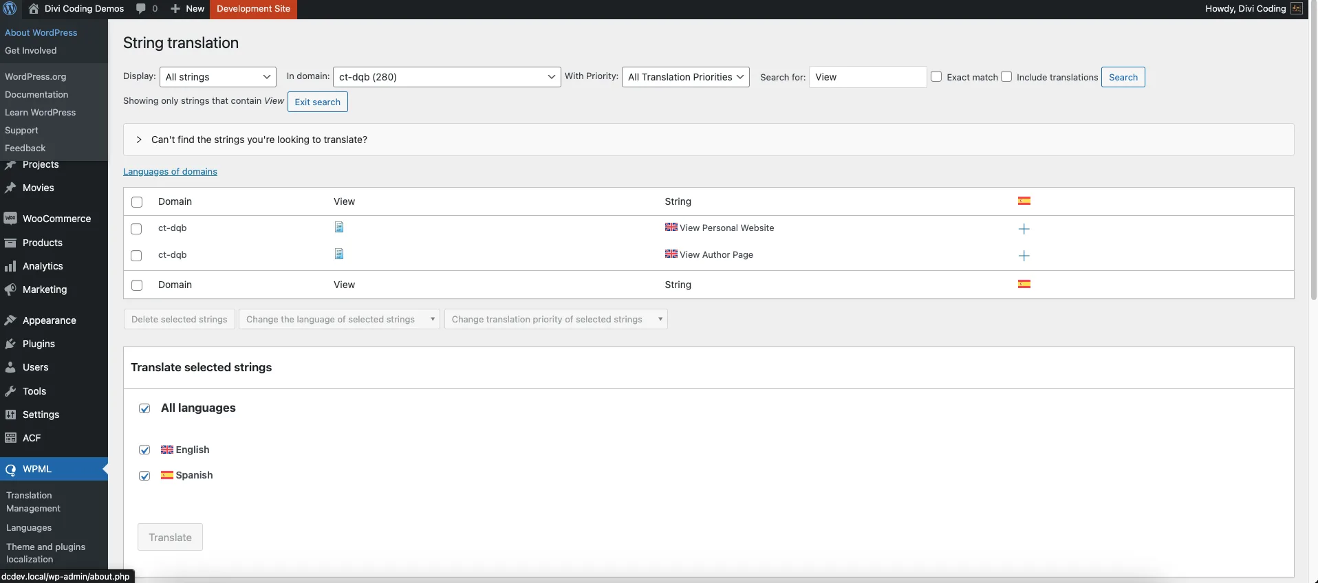 If you then need to translate our default texts that is also possible via the WPML -> Themes & Plugins Localization -> Strings in the plugins, select the Divi Query Builder option and then hit the button “Scan selected plugins for strings”, once it is done click on the “ct-dqb” text domain, that should take you to the WPML -> String Translations screen where you can add translations for each one of our default strings.